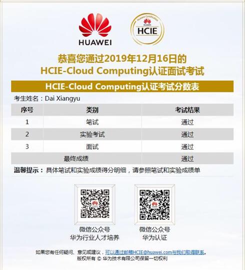 商务信息技术学院戴香玉老师,通过努力学习、奋勇拼搏,在持续备战近一年后,过五关斩六将,经过笔试、LAB、面试三轮考核,一次性高分通过了华为HCIE-Cloud Computing(云计算领 域)认证,获取了HCIE证书。