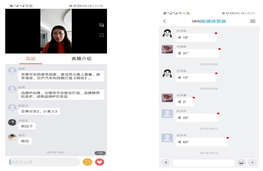 针对授课课时差异和网络条件差异,黄慧化深入地与教师团队沟通,建议采取差异化的授课形式和个性化的教学辅导相结合。于是,在《新媒体营销》课程的教学中,采用“课程平台+辅助平台”的方式,交互使用学银在线、学习通群聊、QQ群和微信群等多个平台,同一时段呈现了录播+研讨、直播+录播、语音+录播、语音+研讨、直播+录播+互动等多种形式,分外亮眼。