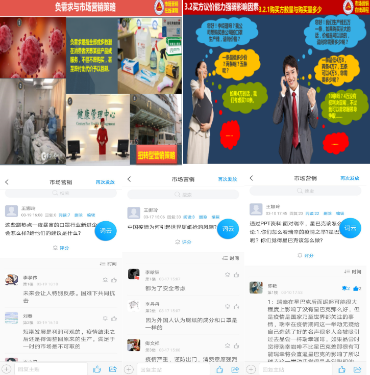 精心挑选教学内容,疫情案例无痕植入。在教学资料的准备过程中,教学团队成员借助各类营销公众号等学习平台搜集大量疫情相关的企业案例,在各知识点中有机融入。如在“需求状态与营销任务”一节授课内容中,以“病毒感染医疗需求”为例说明负需求概念以及应对措施学生深有感触,在“行业环境分析”内容中用“口罩设备购进”模拟活动来解释买方讨价还价能力就比较容易被学生理解??魏笤谘巴ㄌ致矍型üシ?ldquo;转行做口罩暴富”、 “中国疫情引起世界厕纸抢购风潮”、“瑞幸咖啡千里送无人咖啡机” 等新闻来设计与知识点及思政相关思考题引导同学们参与讨论,在知识拓展栏目录制了“2020年新冠疫情后的行业机会”等疫情主题的营销讲座拓宽学生视野同时提高学生职业敏锐度。