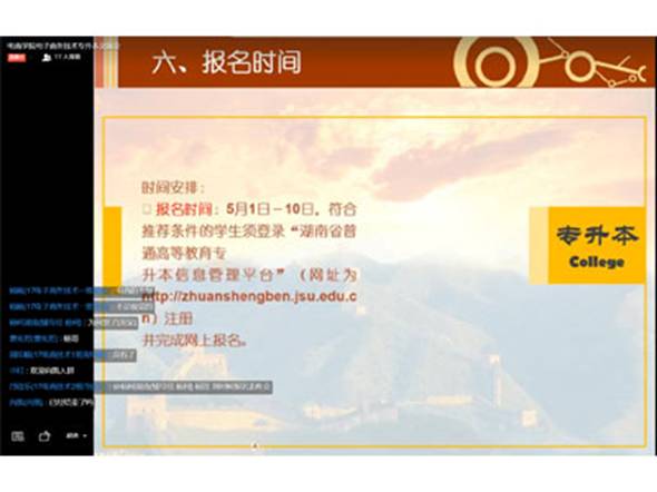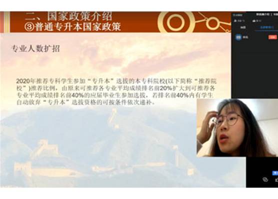 此次交流会分为电商移商专业学习交流会、国商专业学习交流会和电子商务技术专业学习交流会三个直播间开展?;嵘希鞒秩嘶剖槊粢訮PT形式向同学们讲解专升本的相关知识,让同学们对专升本有初步的了解?;嵋橹校辈ゼ涞耐腔岢鑫侍?,各专业的学长学姐们也热情的给与了答复。随后,16级设计1班高宏华、16级电商2班曾盛辉、16级国贸1班李扬以风趣幽默的形式向同学们分享了自己从备考到考前的专升本复习应考经验,并希望在场学生认真备考,珍惜此次学习机会。他们恳切的言辞、用心的分享,赢得了在场学生们一致好评。