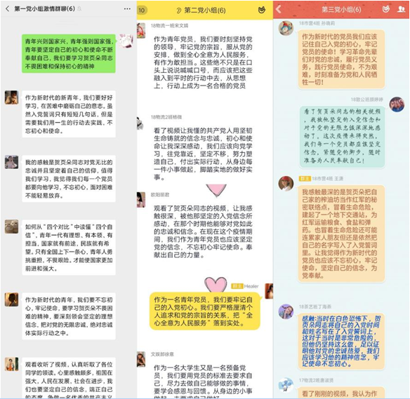 然后,全体党员观看视频《见证初心和使命的“十一书”》,学习贺页朵对党的坚定信念与对国家的无限忠诚,并分组交流观后感。第一党小组陈祉旻同志谈到:“不管遇到什么困难,我们都要坚定步伐跟党走,敢于担当勇作为”;第二党小组欧阳丽君同志谈到:“我们要努力成为有理想、有本领、有担当的新青年,为国家谋未来,为民族聚希望”;第三党小组丁海燕同志谈到:“我们要学习贺页朵同志的英勇忠诚精神,不忘初心,为党和人民作出自己应有的贡献”。