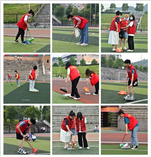校园是我家,卫生靠大家。通过志愿者们的共同努力,学校田径场焕然一新。学校公共场所的卫生需要我们每一个同学的细心呵护,舒适的学习、生活环境也需要大家共同来营造。希望同学们进一步增强文明意识和劳动意识,从我做起,从身边的小事做起,主动参与到爱护环境中来,为美丽校园添新彩!