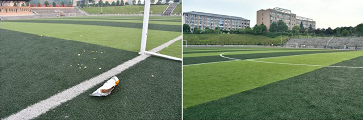 田径场草坪清理前后对比(左为清理前,右为清理后)