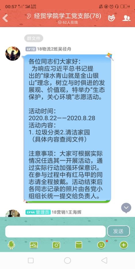(通讯员 颜婷婷)为响应党的号召,践行“坚持人与自然和谐共生”的基本方略。2020年8月22日,经济贸易学院学工党支部开展“生态?;?,关心环境”志愿活动,号召支部全体党员和18、19级入党积极分子于各自所在地的社区、街道、小区或住宅区域积极主动投入志愿环保工作中。