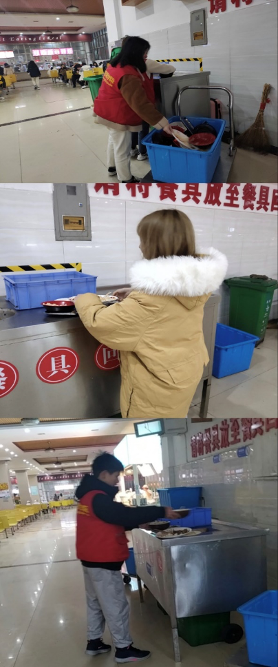 晚餐时间,志愿者们也没闲着,一起到学校食堂为食堂阿姨解决了她们的小烦恼。我们在一食堂和二食堂收拾同学们忘记放置到指定地点的餐具。如果遇到未离开的同学,我们还会耐心地对同学进行劝导,几乎所有同学都会面露羞涩,保证下次一定记得。志愿者们也在轻松愉快的氛围中继续贡献青春的力量。