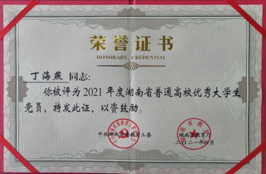 近日,湖南省委教育工委公布了2021年度湖南省普通高校优秀大学生党员评选结果,湖南商务职业技术学院丁海燕同学获评“2021年度湖南省普通高校优秀大学生党员”荣誉称号。