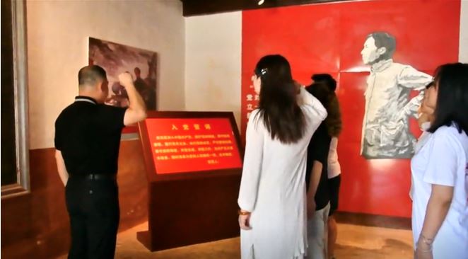 “我志愿加入中国共产党,拥护党的纲领,遵守党的章程,履行党员义务……” 在旧址正堂屋入党誓词前,谢虎军同志带领全体党员,庄严举起右手,在党旗下集体宣誓,共同重温入党誓词,用铮铮誓言来表达作为一名共产党员的责任与担当。90多年前,毛主席在叶家祠阁楼上秘密主持六名士兵的入党宣誓仪式,首开‘支部建在连上’的伟大实践,奠定了党对军队的绝对领导的实践基础和组织基础。今天,志愿者们重走革命圣地,在革命先辈们庄严宣誓处重温历史,重温入党誓词,鞭策自我牢记入党初心,以实际行动为党旗增光添彩。