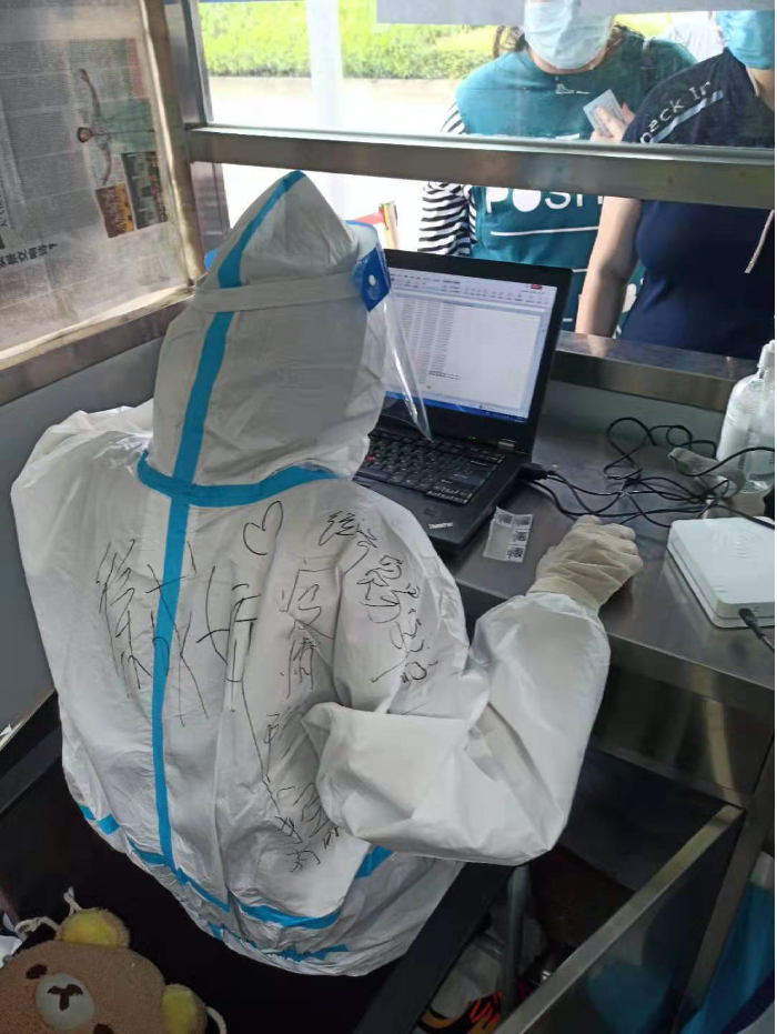 同样冲锋在长沙疫情防控前线的,还有19连锁2班的徐成娇同志。疫情暴发后,徐成娇同志应征成为圣维尔医学检验中心的一名志愿者。她协助人们对核酸检测线上咨询等众多问题。同时,她在核酸检测现场负责核酸检测者信息录入,将每个标本一一对应,然后上传系统方便核酸检测者之后查询结果,以及使数据同步健康码的工作。徐成娇说到:“每天早上打开电脑,滴滴滴的响声就会提醒我进入工作状态。这项工作是个漫长的过程,需要不停地回复和解答相似的内容。但是能够更好地缓解人们对核酸结果焦急等待的心态,是我应尽的职责;能够为祖国贡献一份属于自己的青春力量,更是让我感到无比的自豪!”