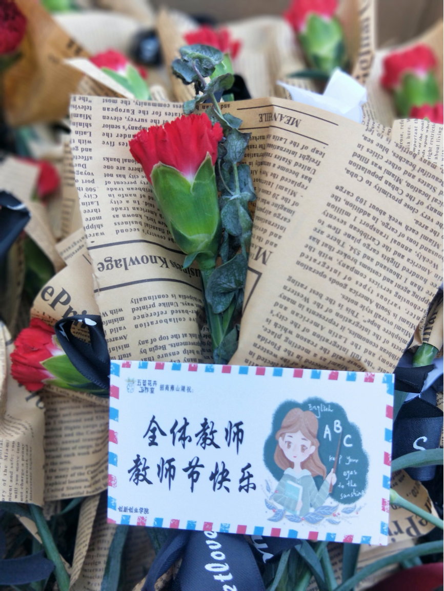五芒花卉工作室联合秋叶聆枫文化传媒工作室开展“鲜花传真意·师恩难忘”活动,准备了近600份小礼物,在学校举行2021年度教师节表彰大会的会场外给老师献礼,给老师的节日带来满满的仪式感;因为有课仍然坚守在三尺讲台的老师们,也有贴心的五芒花卉工作人员将礼物送到教室外面。 “以花之美成人间小爱”一直是五芒花卉工作室的美好期望,他们也一直在为之努力。