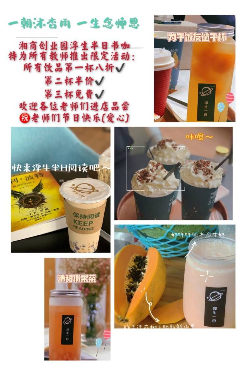位于湘商创业园四楼的浮生半日书咖也为迎接教师节的到来做了充分准备,并特别策划了教师节优惠活动,学院副院长禹明华等老师在教师节表彰大会后纷纷来到书咖,共同享受这节日的幸福。作为学校的网红打卡地,书咖给老师们提供一个温馨舒适的小憩场所;书咖的饮品和服务态度也得到了老师们的一致好评。