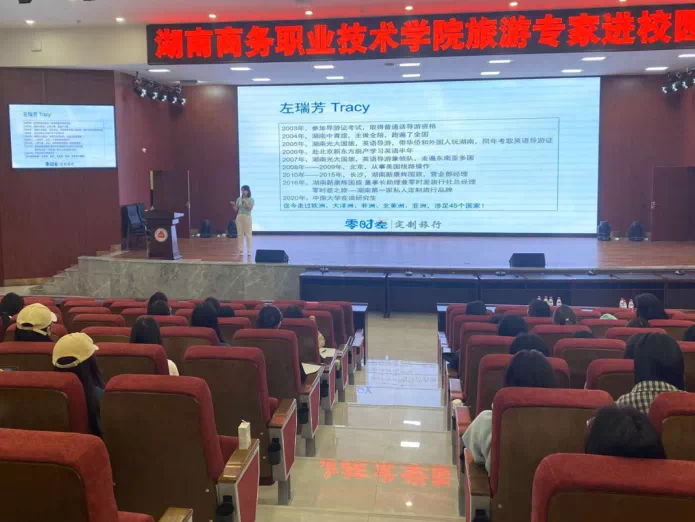 5月16日上午,湖南新康辉国际旅行社导游部经理浦艳向同学们分析了中国旅游的现状,普及了传统旅游企业转型的九个方向等知识。面对新冠疫情的影响,她告诉同学们必须要主动迎接中国旅游变革新时代,只有这样,才不会被时代淘汰。零时差定制旅游公司总经理左瑞芳以“旅游迈入私人定制时代”为主题,介绍目前定制旅游的三种旅游方式,分享如何成为一名专业的旅行定制师。左瑞芳结合自己的求学和工作经历,鼓励同学们随着经济的快速复苏、多元需求的不断变化中,把握好旅游行业发展的机遇,走向未来。