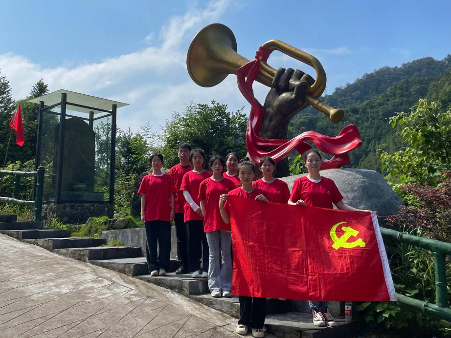 上午8:00,团队成员统一红军着装,佩戴袖章,在红军桥前集合。走上桥面,晃荡的铁索桥、湍急的河流,不禁让我们感受到当时红军过桥的浩荡场面。走过红军桥,映入眼帘的一面吹着号角、举着党旗、冲锋向前的红军战士浮雕。红军“星星之火可以燎原”的步伐从这里疾步向前,“燎原星火”队的追寻之旅从这里开始。跟随道路两侧红旗的指引,我们沿着崎岖的山路,走在由青石块与砂土相间铺就而成的“红军路”上。