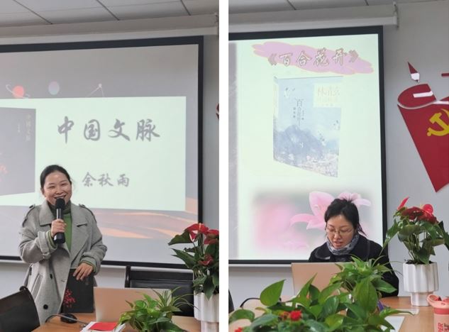 周妮老师推荐的是余秋雨先生所著的《中国文脉》一书,并重点分享了其中“感悟神话”的部分内容。书文通过对女娲补天、精卫填海、夸父追日、嫦娥奔月四个神话故事的重新解读,让聆听者耳目一新,醍醐灌顶。吴婷老师分享的是林清玄的一篇励志散文《百合花开》,文章饱含着“大其愿,坚其志,细其心,柔其气”的人生准则,读来让人信心倍增。