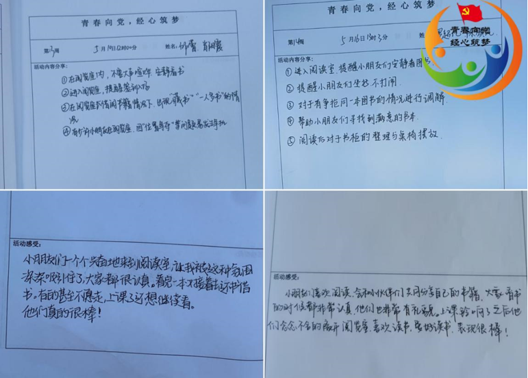 在图书馆里,志愿者们对小朋友需要阅读的图书进行整理,积极引导小朋友们阅读书籍并放回原处,维护图书馆内的阅读秩序。同时,志愿者和家长志愿者积极配合,在阅读时间结束后与家长志愿者一起将图书摆放到正确位置,将地面垃圾清扫干净,给第二天阅读的小朋友们营造一个干净舒适的阅读环境。整理完成后,志愿者们将在本子上记录当天的活动的有关工作注意事项和服务感悟。