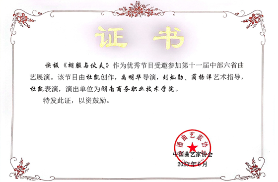 6月28日,由中国曲艺家协会、江西省文学艺术界联合会、上饶市人民政府主办,江西省曲艺家协会、中共上饶市委宣传部、上饶市文学艺术界联合会承办,山西、河南、安徽、湖北、湖南六省曲艺家协协办的第十一届中部六省曲艺展演在上饶市举办。学院辅导员杜凯,携原创快板《胡服与伙夫》,第二次代表湖南省参加展演。中国曲协分党组书记、驻会副主席杨发航,江西省文联党组成员、主席叶青,江西省文联党组成员、副主席张越等领导,点评嘉宾王汝刚、巩汉林、张旭东、范军、孟影、种玉杰,与现场600余名观众一同观看了演出。