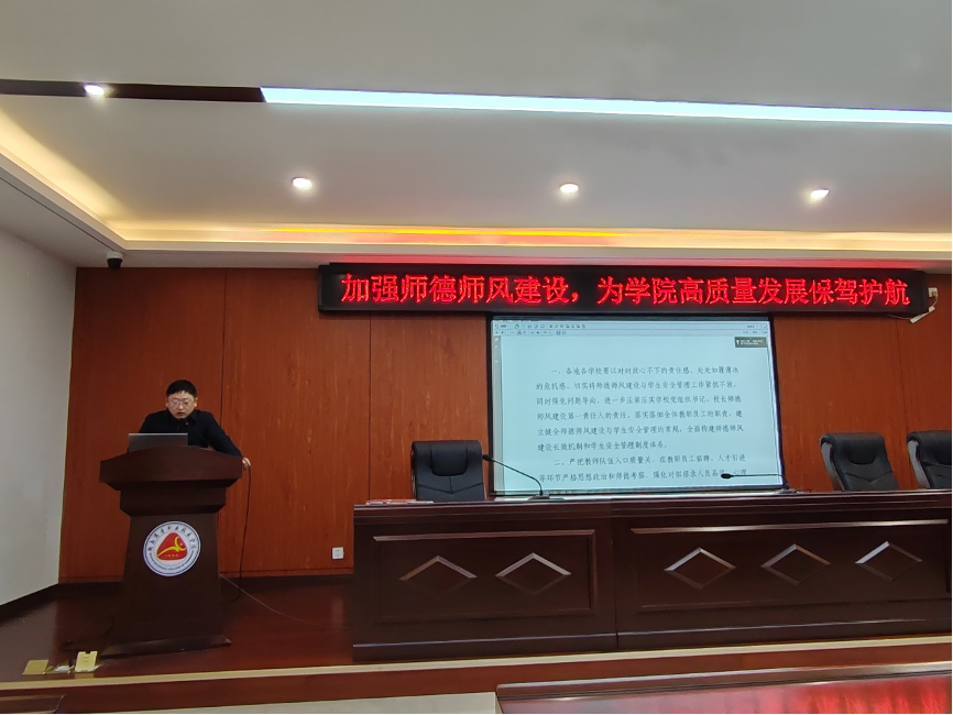(通讯员 方红梅)1月16日,经济贸易学院党总支召集经济贸易学院、茶学院全体教职工开展了以“加强师德师风建设,为学院高质量发展保驾护航”为主题的师德师风建设专题会议,会议由经济贸易学院党总支书记谢立靖主持。