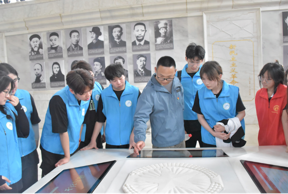 在活动中,旅游管理学院师生不仅以祭献鲜花、默哀的传统方式向英烈们表达缅怀与哀思,还立足学院专业特色和学生特点,将红色革命文化教育与专业教育深度融合。21景区管理专业的杨思露同学、贺柏霖同学,充分发挥专业优势,担任现场讲解,带领大家寻访红色足迹,追忆革命历史。一张张珍贵的照片、一件件革命文物,在他们动情地讲解下,与在场的师生进行了一次跨越时空的心灵对话。