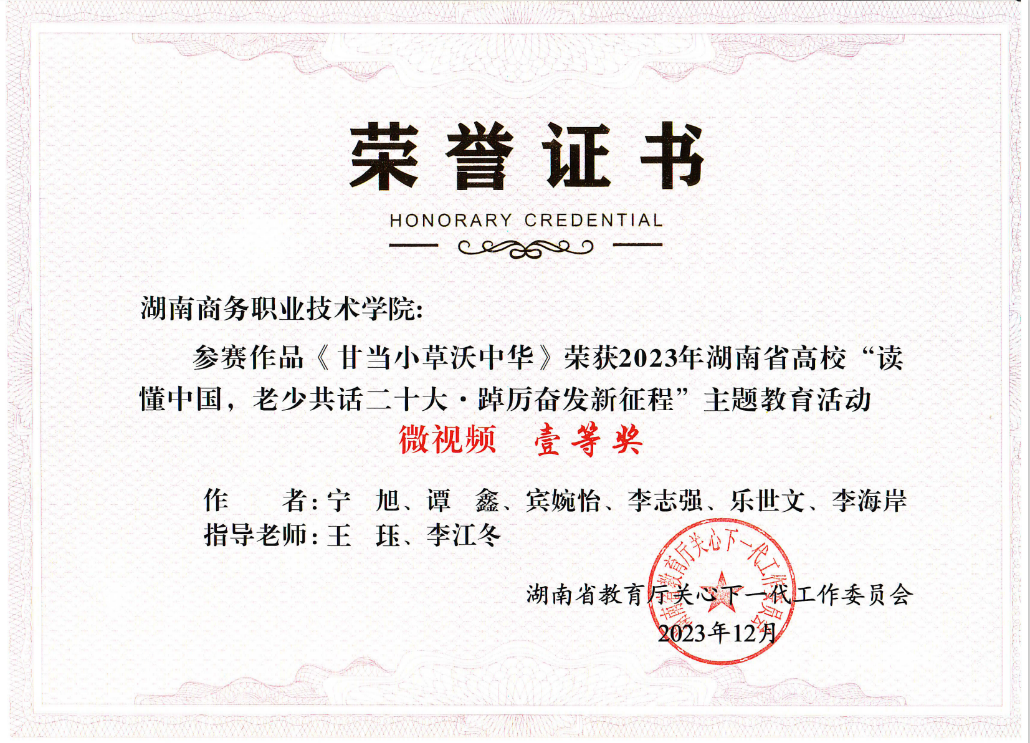 微视频《甘当小草沃中华》获奖证书