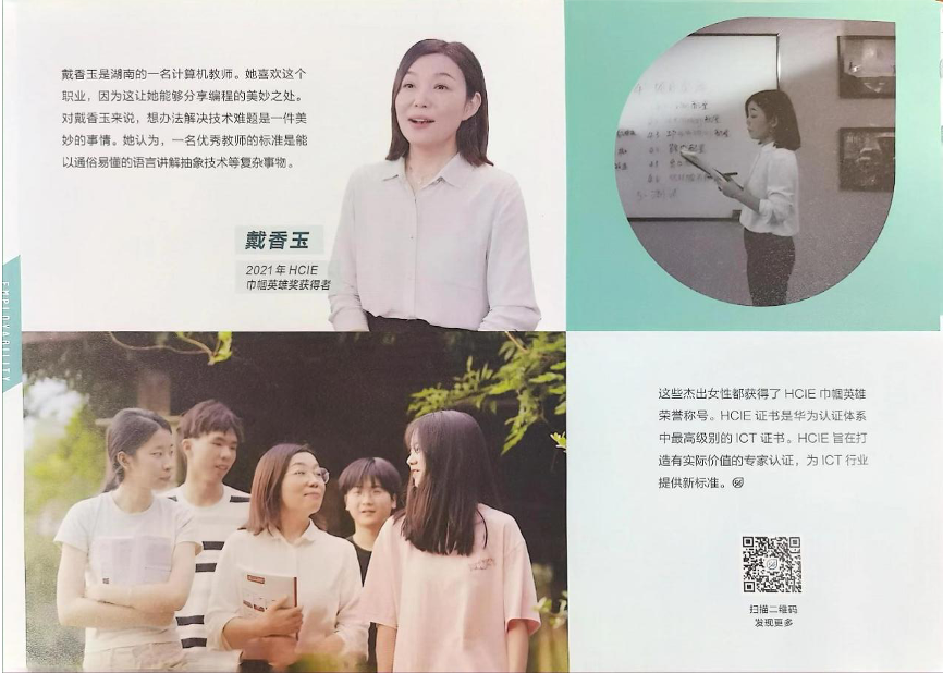 “登上华为‘Seeds for the Future’人才培养宣传手册的封面,并作为人才培养案例出现在‘HCIE巾帼英雄奖获得者绽放生命的活力’主题,确实让我惊喜不已”。戴香玉表示。