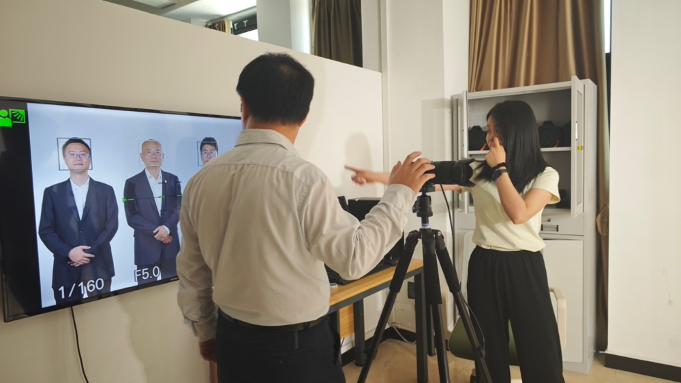 走进实训室,首先映入眼帘的是一排排整齐排列的摄影器材,从高端单反相机到专业三脚架,再到各种镜头和滤镜,无一不彰显着团队的专业与用心。摄影区域的中央,一块巨大的白色背景布平整展开,宛如一张等待绘制的空白画卷,准备记录下每一位教师的独特风采。背景布前,几束柔和的聚光灯从不同角度投射下来,形成错落有致的光影效果。为了营造出更加丰富的层次感,摄影团队还巧妙地利用了反光板、柔光箱等辅助工具,确保每一张照片都能捕捉到教师们的最佳状态。