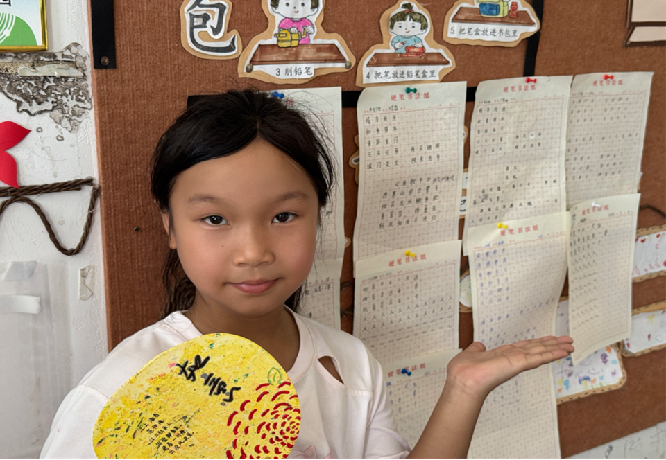 “当孩子们在团扇上写下与渔文化相关的诗歌时,笔墨在扇面晕染开雅致的韵味,这正是他们创造美的生动体现。”书法课任课老师梁涛表示,此类实践让乡村儿童在文化根脉中汲取力量,以美育赋能乡村振兴。美育作为传承中华文明的重要方式、增强文化自信的重要力量,正通过这样的实践,让孩子们在与传统的对话中建立文化认同。