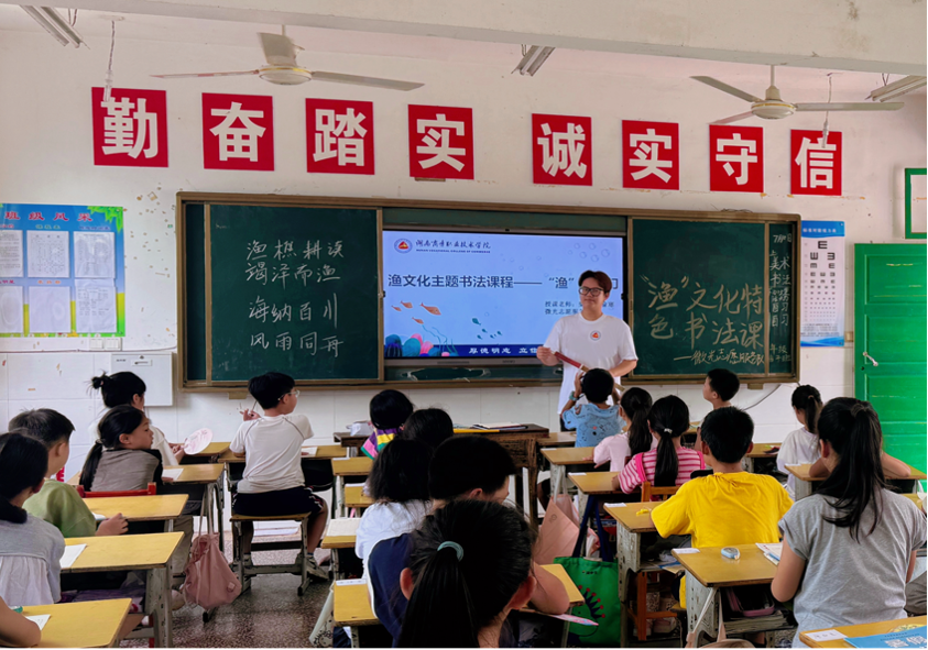 7月10日,湖南商务职业技术学院微光志愿服务队深入益阳市安化县岩坡小学开展暑期“三下乡”活动。为弘扬中华传统文化、增强文化自信,推动乡村美育发展,团队以“渔文化”为切入点,开展书法美育活动,通过经典渔事故事与书法教学融合,让孩子们在笔墨间感受传统文化魅力,在发现美、鉴赏美、创造美的过程中提升文化理解能力,推动乡村美育与文化传承深度结合。