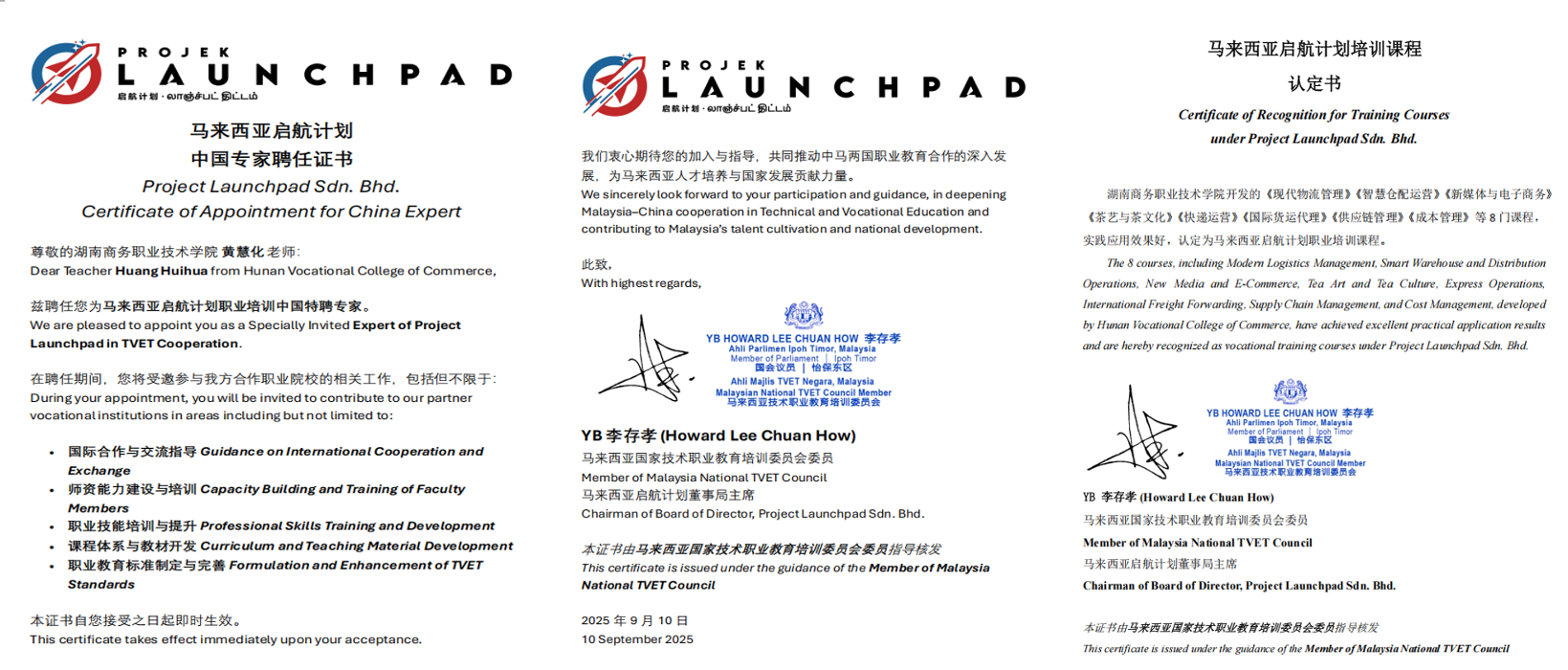 近日,经济贸易学院在国际职业教育合作领域取得重大突破,陈学忠、黄慧化、禹?;?、辛磊、成莹洁、朱波、李园、彭庆、卢宇、毛斑斑、钱秋兰等11位教师正式被马来西亚国家技术职业教育培训委员会(Member of Malaysia National TVET Council)认定为“马来西亚启航计划职业培训中国专家”。这11位教师均在各自专业领域拥有丰富的教学和实践经验,他们将作为中国职业教育的代表,为马来西亚“启航计划”提供专业的培训、咨询与指导。同时,学院开发的《现代物流管理》《智慧仓配运营》《新媒体与电子商务》《茶艺与茶文化》《快递运营》《国际货运代理》《供应链管理》《成本管理》等8门优质课程也同期获得该委员会认证,纳入马来西亚“启航计划”职业培训体系,直接服务于马来西亚技术技能人才的培养,助力其产业升级和经济发展。