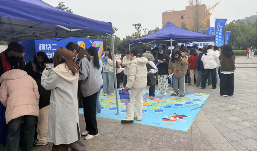 12月2日,湖南商务职业技术学院孔子广场化身沉浸式“生涯探索乐园”,一场别开生面的“生涯嘉年华”活动在此热烈展开?;疃?ldquo;线上互动+线下体验”双线融合的形式,将职业规划转化为八大趣味闯关游戏,吸引众多学子在轻松参与中探索自我、展望未来。