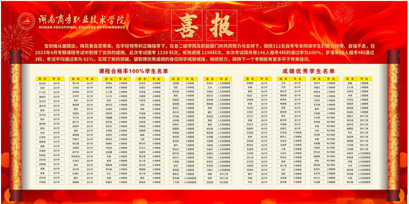 鹏程万里今朝始,宏图大展正当时;书山勤磨剑锋利,学??嘤位ㄏ阆S乓斓某杉ɡ氩豢亲陨淼呐?,也离不开学院领导及自考班主任老师们的谆谆教导。希望取得优异成绩的同学不骄不躁,再接再厉,也希望全体同学以先进为榜样,奋力拼搏,争取在未来取得更辉煌的成绩!