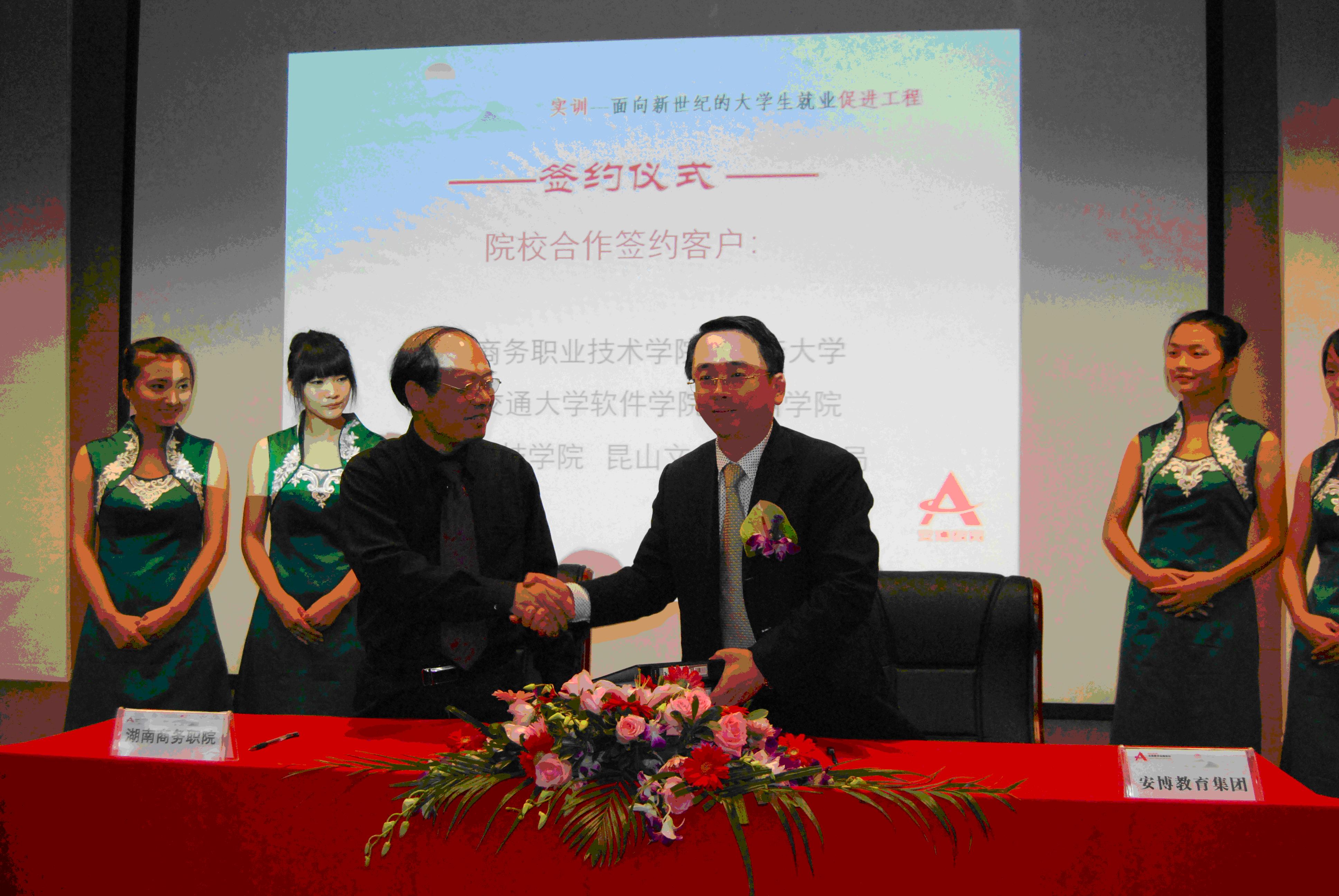 2009年11月17日,我院张新民院长、杨文涛副院长、袁仁水总支书记、冯中平副处长一行前往安博(昆山)服务外包产业园举行的“2009首届安博教育高端论坛”,在会议期间,我院领导受到了安博高层领导的热烈欢迎,并对昆山服务外包基地进行了全面的考察,与对方进行了深入的交流。在原有合作的基础上,在友好的气氛下,双方对未来的合作进行了进一步的探讨,最后,双方就专业共建合作达成了共识,签署了专业共建协议。院长张新民与安博职教事业部总经理黄贵洲在大会上进行了签约仪式。
