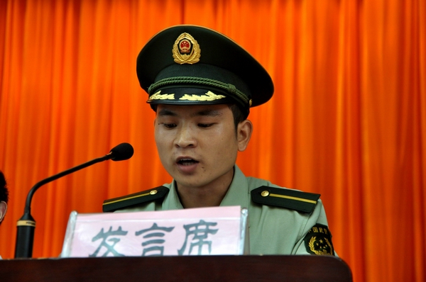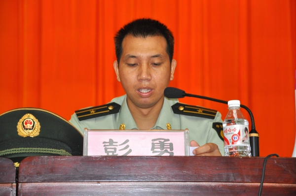 随后,军训团团长彭勇代表长沙武警指挥学院59名官兵发表讲话。彭团长希望新生在为期十天的军训洗礼中,做好吃大苦、流大汗的准备,要在军训过程中强化组织纪律观念,提升自己的综合素质。