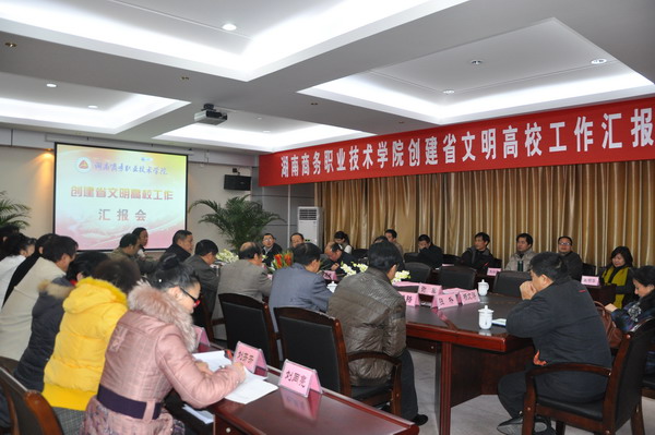 学院党委副书记孔军山向与会专家汇报了学院文明高校创建的工作情况。他说,在省委教育工委、省教育厅、省供销合作总社的正确领导下,学院抓住机遇,加快发展,始终注重文明高校创建、和谐校园建设工作,校园文明程度不断提升??赘笔榧谴影煅跫?、师资力量、内涵建设、人才培养以及行业办学、社会服务五个方面介绍了学院的基本情况,并指出创建文明高校是实践“三个代表”重要思想和落实科学发展观,坚持社会主义办学方向的必然要求;是提升学院软实力和综合竞争力的现实需要;是打造“生态、和谐、人文”学院的前提条件,它为顺利实现学院的长远发展规划与目标奠定坚实的基础。我院的文明高校创建工作,坚持“以评促建,以评促改,评建结合,重在建设,意在育人”的方针,以中央和湖南省委关于精神文明建设的方针政策为指导。党委高度重视文明创建工作,成立专门机构,采取各部门联动的形式开展各项文明创建工作。同时,贯彻“以评促建”,持续开展创建工作,充分利用学院广播、报刊、网站、橱窗等舆论阵地,进一步开展广泛深入地宣传教育,使文明高校创建活动深入人心,营造浓郁的文明高校创建氛围。