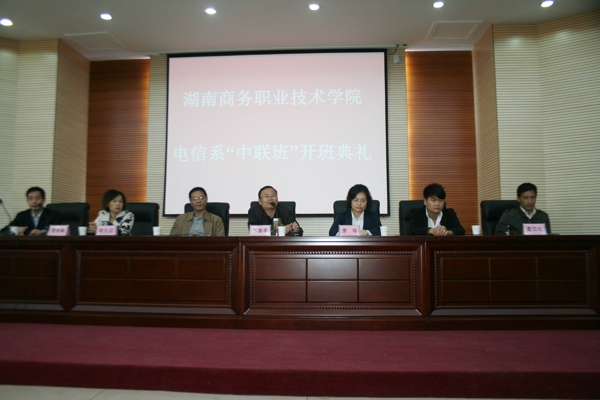 接着,电子信息系党总支书记袁仁水发言,他简单介绍了“中联班”的情况,并希望此次合作能够达到学校、企业、学生三赢的目标。随后,教务处处长伍建桥提出企业和系部应认真制定本班的课程计划,老师要针对企业需要进行教学,学生要有动力和方向,将重点放在学习上,努力为企业服务。