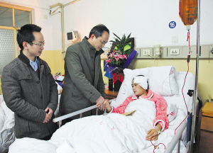 市旅游局派人专程来到医院看望在车祸中受伤的导游谭莎。余志雄 摄
