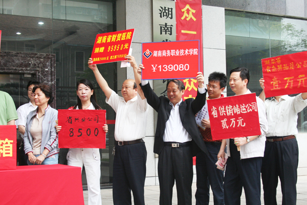 5月15日,学院党委书记彭建国、院长张新民及全体院领导承载着学院全体师生颗颗爱心来到省供销社募捐现场,向灾区人民献出了商务职院师生的一片浓浓爱心。爱心捐款将由湖南省民政厅负责送达灾区。我们坚信在党中央的坚强领导和全国人民齐心协力的支持与帮助下,定能将灾害损失降到最低程度,使灾区人民重建家园。