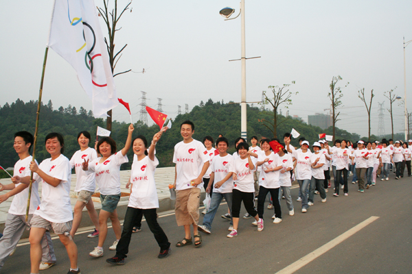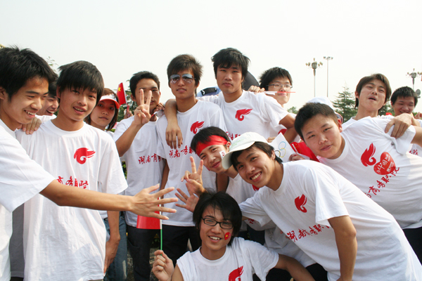 北京奥运圣火6月4日上午8时许在湖南风景如画的爱晚亭前开始传递,商务学院4千多名师生齐聚岳麓大道长沙市政府前,迎接圣火的到来。