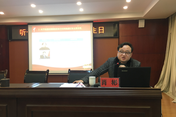为深入贯彻学习党的十九大精神,岳麓区组织辖区内高校和党校优秀思想政治理论课教师开展了“十九大精神进社区”宣讲活动。我院思政课部肖彬老师作为长沙市及岳麓区市区两级理论宣讲团成员,于12月20日走进洋湖街道白庙子社区为社区党员群众宣讲“习近平新时代中国特色社会主义思想”。