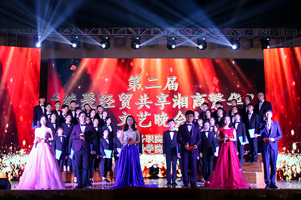 晚会在一曲优美的开场舞《一波湘水 荡湘云》中拉开帷幕。经贸学院院长易能向在场师生表达了美好祝愿,希望同学们树立健康向上的人生理想,把握人生,成就精彩,将自己最美的青春献给这个最好的时代。之后的表演中,小品、话剧、歌曲、舞蹈等节目轮番上阵。其中,16国贸专业带来的舞蹈《RunawayBaby》,节奏紧凑,动态十足,展现了当代大学生的青春与活力。17市营1班表演的小品《不忘湘心》诙谐幽默,引得观众阵阵喝彩。17电商1、2班共同演绎的《幕影青春》紧扣大学三年的时光,以新颖的表演形式展现了时光如梭的青葱岁月。晚会上,同学们的舞台创意和表演才能,得到了在场观众的交口称赞。晚会在该院团学分会代表团集体朗诵的《湘商魂》中圆满落幕。