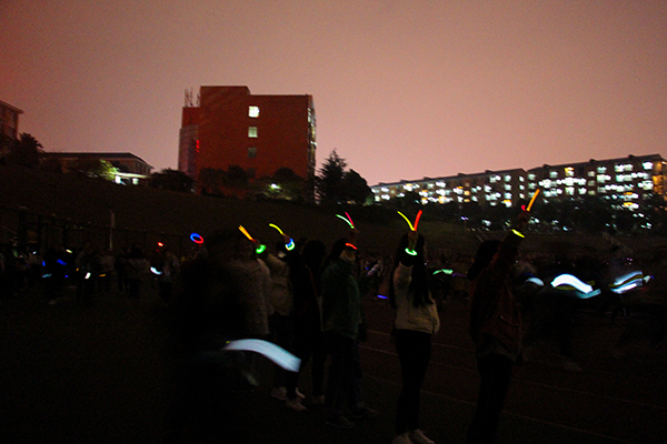 11月21日晚9:00,伴着活动开始的号角吹响,同学们头戴荧光饰品,手握荧光棒,跟随着音乐律动,在跑道上奔跑起来。一条荧光闪闪的“河流”在学院田径运动场开始流淌,更是有国旗班的学生们,他们排成一个整齐的方阵,喊着嘹亮的口号,健步向前。