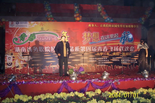 为弘扬商务经贸文化,展示当代大学生综合素质及创新能力,2008年12月16日晚在前操场经贸系举办了第四届青春飞扬联欢会,院党委副书记孔军山、学生工作处处长刘沈荣、副处长唐柳荷、经贸系主任易能、副主任易兰华、骆清等应邀出席联欢会,全院约3000名学生观看了本次联欢会演出。