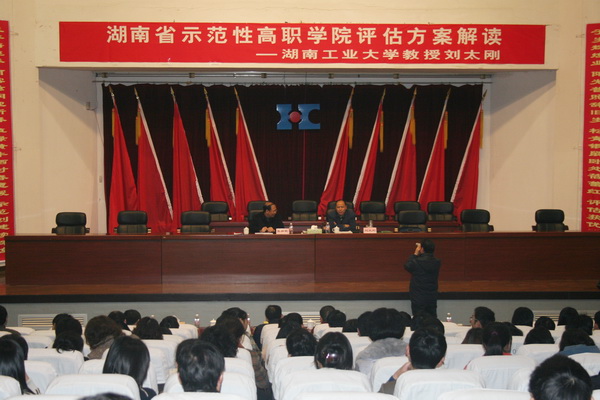 应我院邀请,2月24日下午,全院教职员工聚集在熙源大酒店(湖南厅),聆听了来自湖南工业大学刘太刚教授对湖南省示范性高职学院评估方案的解读讲座。讲座由张新民院长主持。
