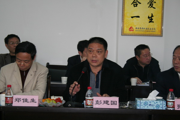 座谈会上,学院党委书记彭建国代表学院发言。他提出“深化校企合作、构建为农服务新体系”的战略设想。他首先从基础设施建设、师资力量、教学质量、社会影响四个方面向在座的各位领导和各行业领导人、企业老总介绍了学院的基本情况。他指出学院近几年办学发展的核心指标主要体现在四个方面:一是实现了学院的整体搬迁,二是有一支好的教学队伍,三是教学质量上了一个新台阶,四是社会影响逐步扩大。我们学院自始自终都坚持本在“商”,根在“农”,走农商发展的道路。我们当前的任务是要积极参与到新农村建设上来,打造具有商务特色的教育体系,组建现代商务职业教育集团,为学院更好地融入社会搭建一个平台,也是建立一个融合学院,有利社会、企业参与的平台,升华企业与学院的更深层次合作,现代商务职业教育集团主要任务是培养人才,为企业进行更有针对性的人才培养。现代商务职业教育集团将于4月17日在长沙召开成立大会。