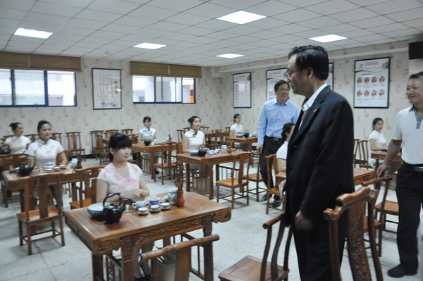 学院党委书记周忠新代表学院向友志副省长汇报了学院近年发展情况:2012年被授予“湖南省示范性高等职业院校”,2013年高质量通过教育部第二轮高职高专人才培养水平评估,特别是在2013年全国职业院校技能大赛中,学院共有6个项目代表湖南省参赛,其中会计技能竞赛项目获全国一等奖,导游、茶艺技能竞赛等4个项目获全国二等奖。学院与麓谷科技园合作建设了“麓谷科技信息学院”,与省茶业集团、省茶叶协会等联合兴办了“湘茶学院”,招生就业稳居省内前列,校园二期规划建设现已完成设计总图的全部报建、报批手续,后勤资产回购积极有序推进。友志副省长对学院紧跟现代职教发展步伐、加强内涵建设、服务供销行业和地方经济发展取得的成绩,给予了充分肯定,并饶有兴致地参观了我院田径场、湘商文化院、茶文化室等, 在了解学院田径场是按照鸟巢标准设计,可满足各类大型赛事要求时,欣喜地称赞学院领导班子“想干事,也能干成事”!在参观学院新建的湘商文化院过程中,对湘商精神的提炼表示赞同,谦虚地说:“今天我学了很多知识”,并签名留念,对学院注重传统文化育人、打造文化品牌、提升学生人文素质给予了高度评价。