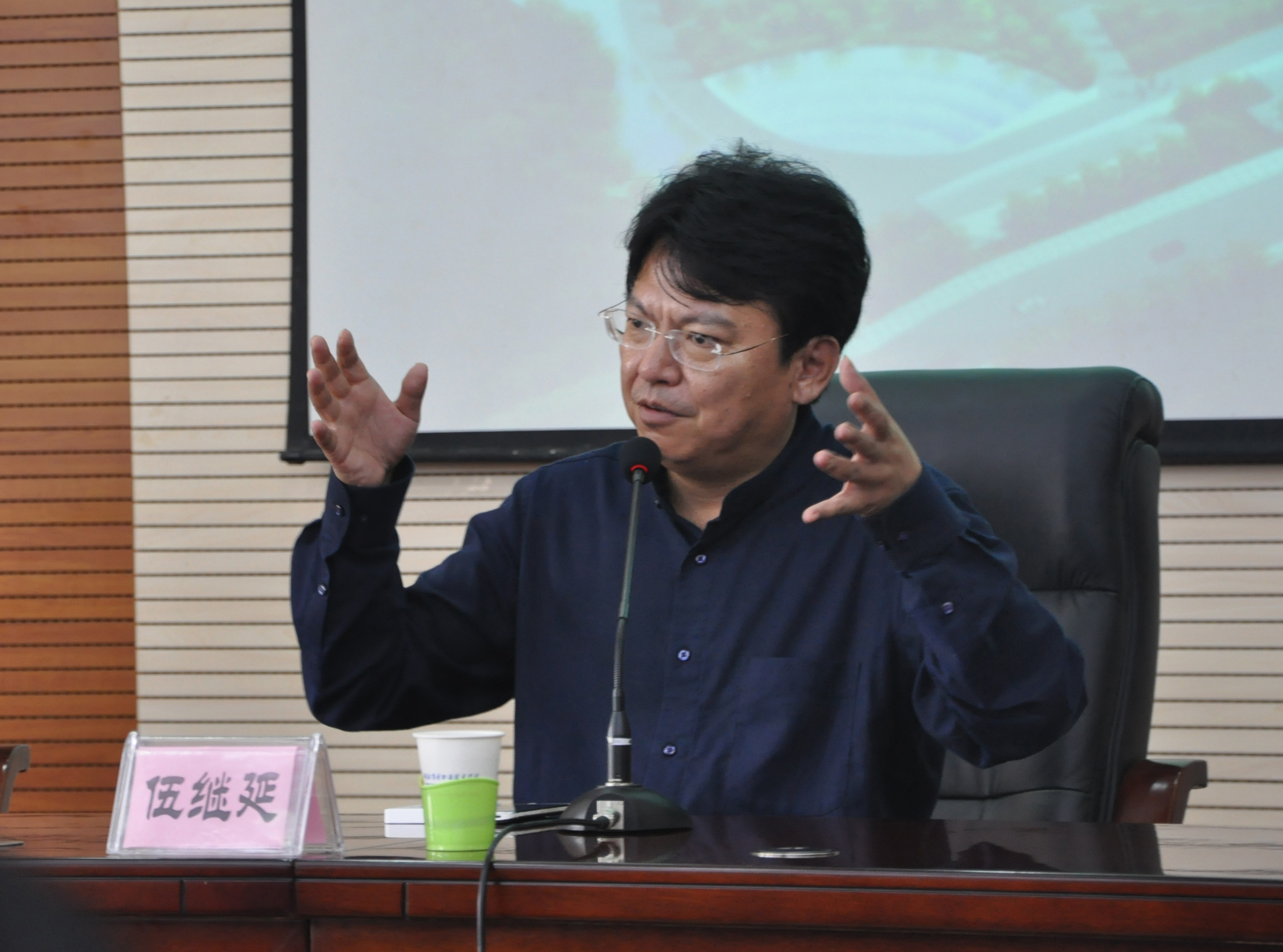 伍继延,湘商文化核心人物、湘商协会会长,也被称为“湘商第一人”。在本次讲座上,他以《湘商文化经营天下》为题,从威名天下的湘军讲起,介绍了以蚩尤为代表的湖湘文化崇文尚武的文化起源。他指出,湖南政治、军事的辉煌,致使湘商被淹没和忽略。湘商自闭关锁国受创伤以来到80、90年代才凭借“草根”的努力和改革东风重新复苏。通过列举各时期湘商的代表人物和商业现象等,他推断湘商必定成为继湘军、湘政之后的又一品牌。他指出,所谓“湘商文化”,就是市场经济条件下的一种转型,认为“湘商精神”就是心忧天下的责任精神、敢为人先的创新精神、经世致用的务实精神、兼容并备的和谐精神、实事求是的诚信精神。