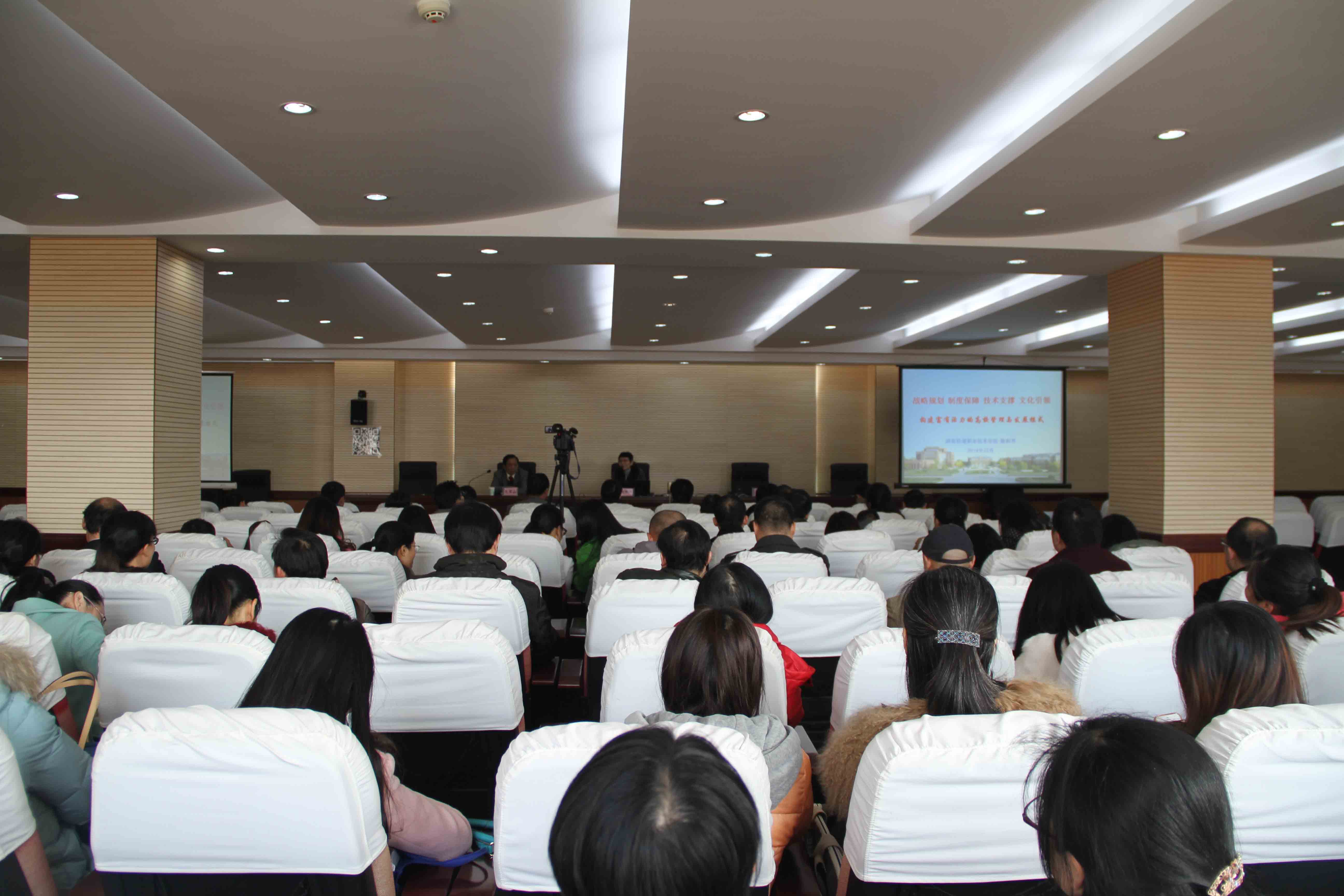 16日下午2:30,学院全体教职员工在办公楼六楼职工会议厅聆听了湖南铁道职院院长姚和芳关于高校管理的讲座。