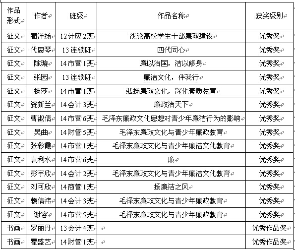 近日,在中央党校中国马克思主义研究基金会和湖南省教育厅等单位联合举办的《关于开展毛泽东廉政文化思想与青少年廉洁文化教育专题活动》中,我院电信系蔺洋扬等十四名同学的征文荣获优秀奖,罗丽丹等两位同学书画作品荣获优秀作品奖,我院荣获此次活动优秀组织奖。具体获奖名单如下: