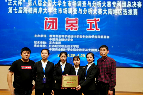 4月29日,由教育部高等学校统计学类专业教学指导委员会和中国商业统计学会共同主办的第八届全国大学生市场调查与分析大赛,专科组总决赛在江苏经贸职业技术学院落下帷幕。经过激烈角逐,在全国各地82支队伍中,由16级商务管理专业王珍芬、张如佩、李广莲、阳易菲4名同学组成的湖南商务职院代表队,在卢宇老师和陈兵老师共同指导下,以小组赛第一的成绩出线,最终以决赛第四名的成绩荣获全国一等奖。