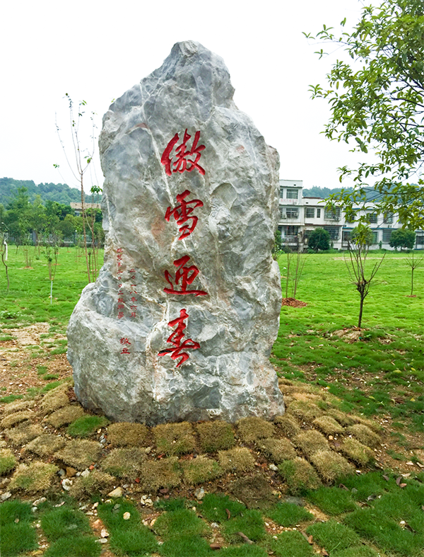 菊花石重6吨,高4米,质地圆润。石头正面镌刻文字“傲雪迎春”。梅,傲雪裁冰迎桃李,冬季落雪后迎来的是万物复苏的春天,学生也将进入校园。寓意学院莘莘学子桃李满天下。