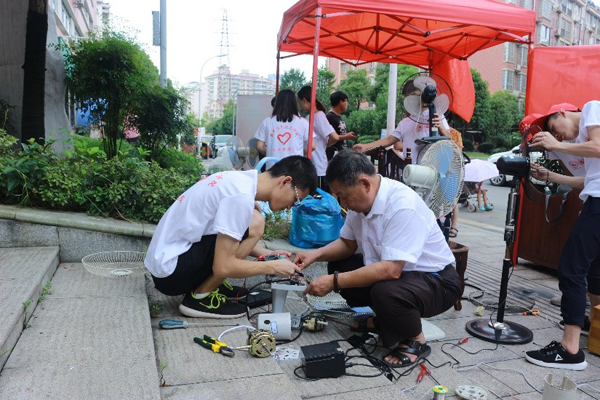 义务维修活动受到了社区居民的热烈欢迎,送修者络绎不绝。志愿者们共收取需维修电器130余件,其中修好复原100余件,主要是电吹风、电风扇、排插、电热水壶等家用小电器。志愿者们分工合作,组织有序开展,先由专人登记送修电器名称、故障、送修人及联系方式,再由专业维修人员进行检测维修,最后登记维修情况并反馈给居民。天气炎热,志愿者们的爱心更热。志愿者们不畏酷暑,头顶骄阳,汗流浃背的坚持维修,赢得了社区居民的一致好评??吹骄用衩锹獾拿嫒?,队员们的内心满是成就感?;疃诩?,志愿者们始终热情高涨,心中满是老人的期盼和孩子渴望的眼神,骄阳酷暑坚守义务维修。