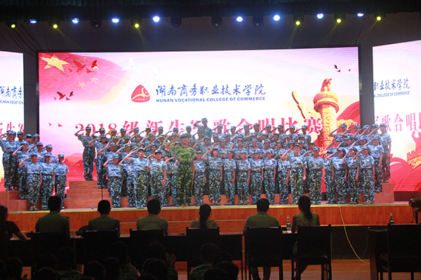 本网讯(记者 刘钰 刘妙)9月20日晚7时30分,2018届新生军歌合唱比赛决赛在校体育馆举行。军训团团长南国利剑国防教育基地副主任王政华、副校长廖良林、军训团参谋长南国利剑国防教育基地副主任金辉、学工处处长唐柳荷,学工处老师罗永红、陈慧军,校团委老师黄郁娇等作为评委全程出席本次比赛。